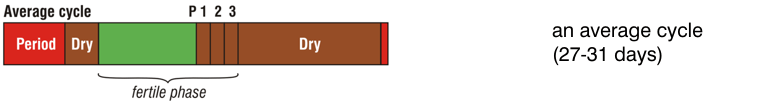 The DRY infertile days after the period (brown block) stretch to several days (even weeks, in really long cycles). Eventually the fertile mucus appears (green block), leading up to ovulation around PEAK Day. After the count of 3 dry days after PEAK, to allow for the release and life span of the egg, the rest of the cycle is infertile (brown block).